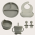 W skład zestawu wchodzą wszystkie niezbędne elementy do codziennych posiłków Twojego dziecka: talerz z trzema przegrodami, miseczka, silikonowy śliniak z kieszonką na resztki jedzenia, zestaw sztućców (łyżka i widelec), a także kubek niekapek ze słomką. To idealny zestaw do nauki samodzielnego jedzenia, który jednocześnie chroni ubrania dziecka i ułatwia rodzicom sprzątanie.