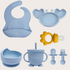 Zestaw zawiera talerz z trzema przegrodami, sztućce (łyżkę i widelec), silikonowy śliniak z kieszonką na resztki jedzenia oraz kubek niekapek ze słomką. Dodatkowo, do zestawu dołączony jest podajnik na przekąski, który ułatwia wprowadzanie nowych pokarmów do diety dziecka. Silikonowy materiał jest nie tylko miękki, ale również odporny na wysokie temperatury, co pozwala na podgrzewanie jedzenia w mikrofalówce. Ponadto, naczynia są łatwe w czyszczeniu, co czyni je idealnym wyborem dla zapracowanych rodziców.